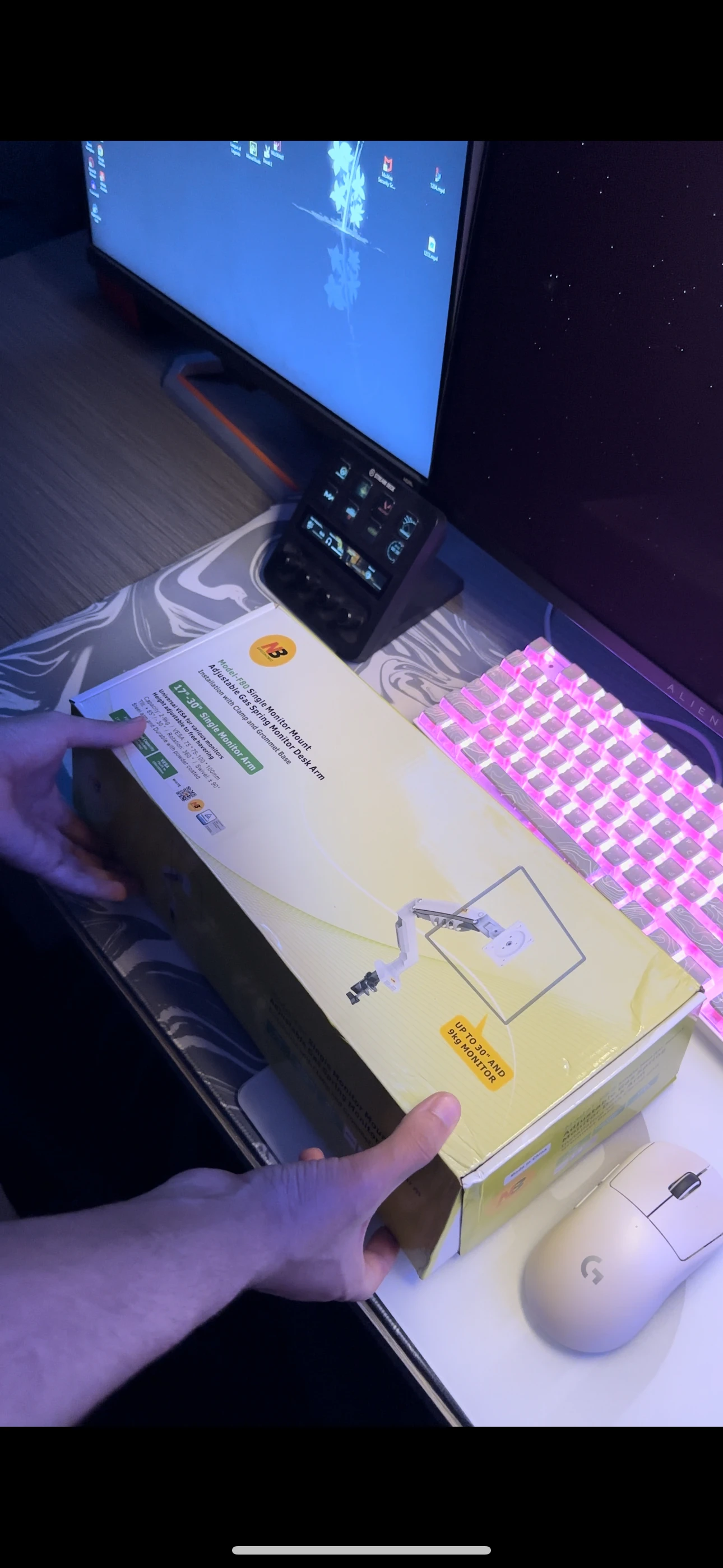 Darrick Dach Pour ce prix, c'est correct. Mon moniteur LG 27" 27GS85Q-B tient bien. Le plus important, beaucoup d'espace a été libéré sur la table. L'ajustement est adéquat. La livraison de Cainao est terrible. Il serait préférable de commander par courrier.